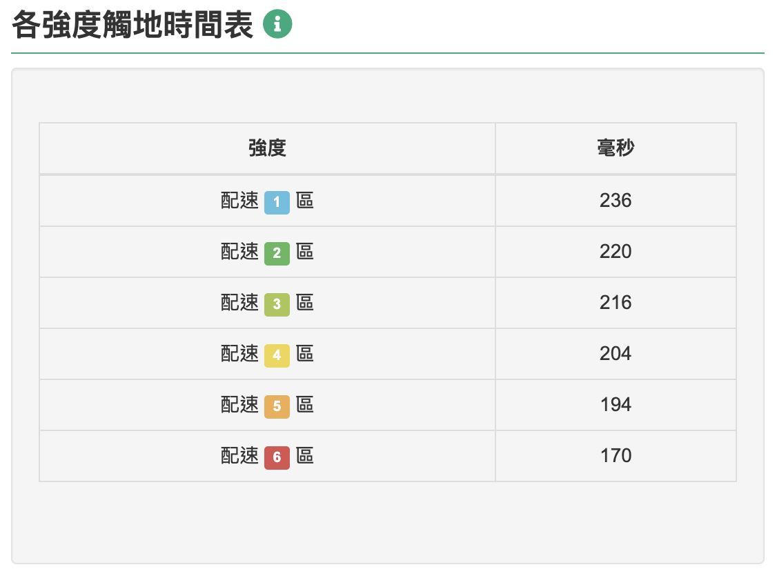 在 RQ 的跑步技術分析裡,有一張表叫做「各強度觸地時間表」。我用一位學員的數據,給大家當作參考。他的表現很優秀,也很有代表性。